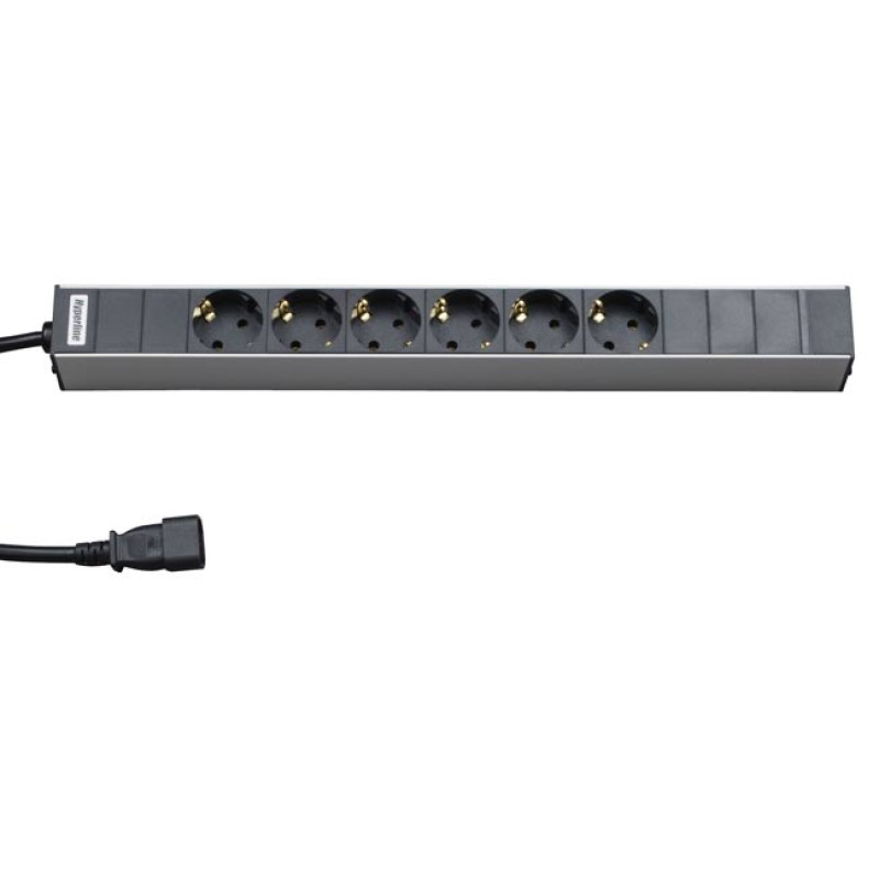 Блок силовых розеток Hyperline, горизонтальный, Shuko х 6, вход IEC 320 C14, шнур 2,5 м, 1U, 482,6х44,4х44 (ШхГхВ), 16А, алюминий