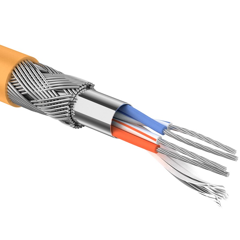 Кабель интерфейсный промышленный Rexant 01-9842-2, AL/TCu, 2 пар., кат. 5e, AWG24, нг(А)-LS, 305м, бухта, цвет: оранжевый. Витые пары состоят из многожильных медных лужёных проводников с изоляцией из полиэтилена, заключённые в общий экран из алюминиево-полиэфирной фольги и лужёной медной оплётки. Волновое сопротивление 120 Ом. Наружная оболочка с низким дымо и газовыделением, подходит для наружной и внутренней прокладки. Срок службы кабеля 25 лет.