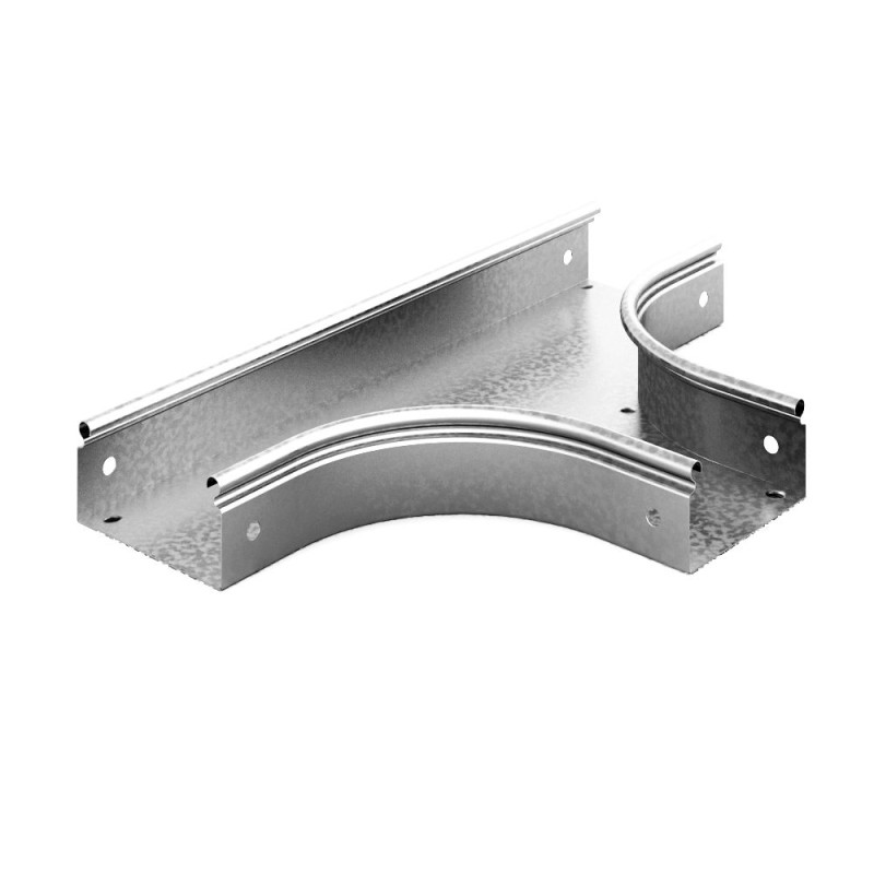 Т-образный ответвитель служит для организации поворота и разветвления кабельной трассы. Соединение лотка с т-отводом осуществляется при помощи соединителя СЛУ (стык вплотную), либо внахлёст. Для всех типоразмеров Т-отводов принцип соединения одинаков.