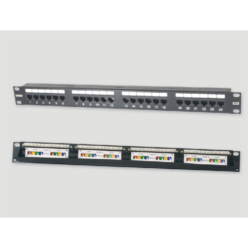 Неэкранированная коммутационная патч-панель 27B-U6-24BL. Одна из составных частей структурированной кабельной системы (СКС). Неэкранированная коммутационная патч-панель представляет собой, 24 соединительных разъёма RJ45(8P8C), расположенных на лицевой стороне панели. С тыльной стороны панели располагаются разъемы типа dual IDC, для заделки витой пары. Предназначена для установки в 19" оборудование, высота неэкранированной коммутационной патч-панели составляет 1U. Соответствует категории 6 и стандартам T568A и T568B. Относится к пассивному сетевому оборудованию. Поставляется черного цвета.